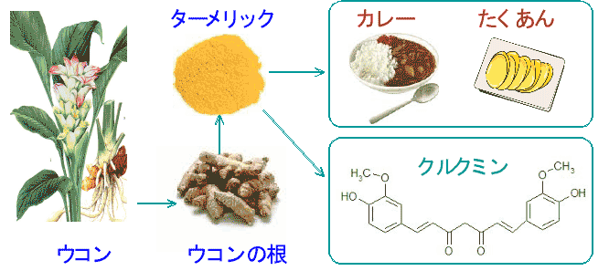 ウコン(Curcuma longa)はショウガ科の植物で、インドや東南アジアなどの熱帯地方、国内では沖縄・九州南部・屋久島に自生し、また栽培もされています。その根の部分は生姜に似ており、その乾燥粉末は「ターメリック」という香辛料であり、カレー粉の黄色い色素の元でもあるので馴染み深い食材です。黄色色素を利用してたくわんの着色剤やウコン染めの名で染料としても使われています。脂質の酸化を防ぐ作用があるため、食品の酸化防止剤としても利用されています。ウコンの粉末(ターメリック)には3〜5%程度のクルクミンが含まれています。(下図)